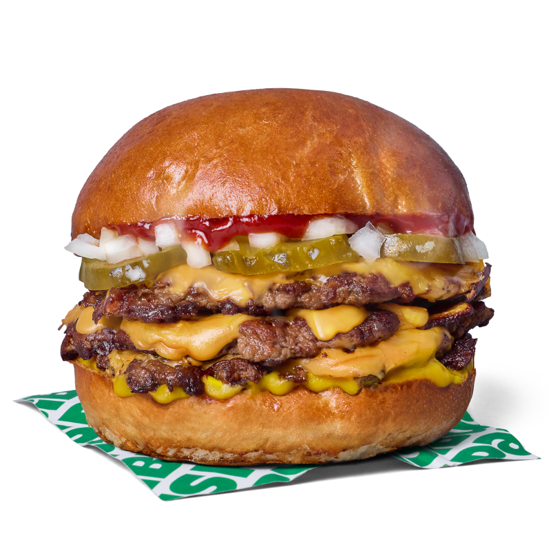 3 x 100% smashowanej wołowiny, bułka maślana, 3 x topiony ser cheddar, ogórek kiszony, ketchup, musztarda, biała cebula